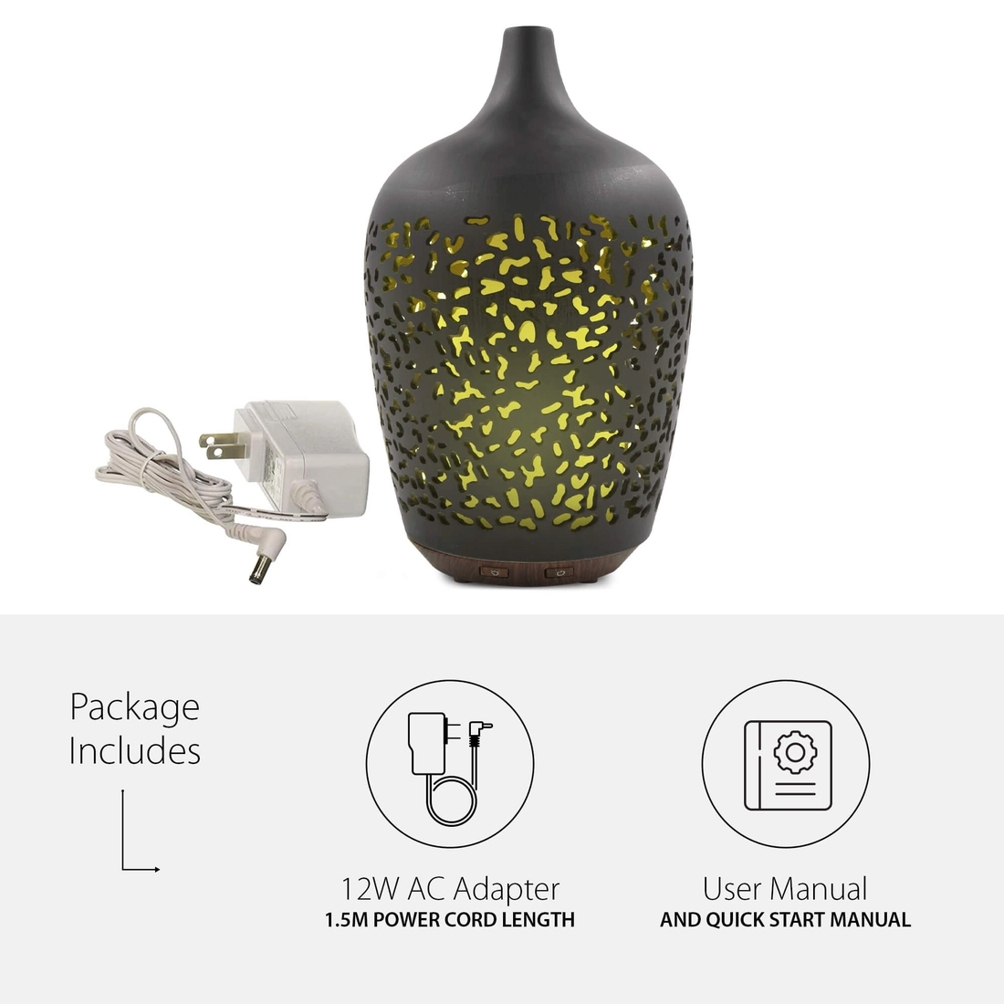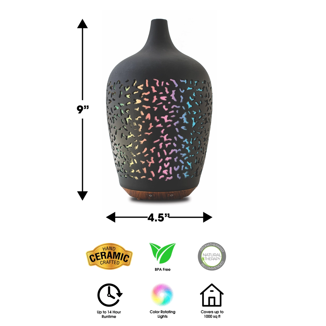 The Lux Elena diffuser is more than just a functional piece; it’s a statement of luxury and modernity. Crafted from real black ceramic, this diffuser creates a serene ambiance while enveloping your room in the soft mist of your favorite essential oils. Its sleek and artistic cut-out design allows either warm white light or a rotating spectrum of colors to dance through, creating a calming glow in any space.