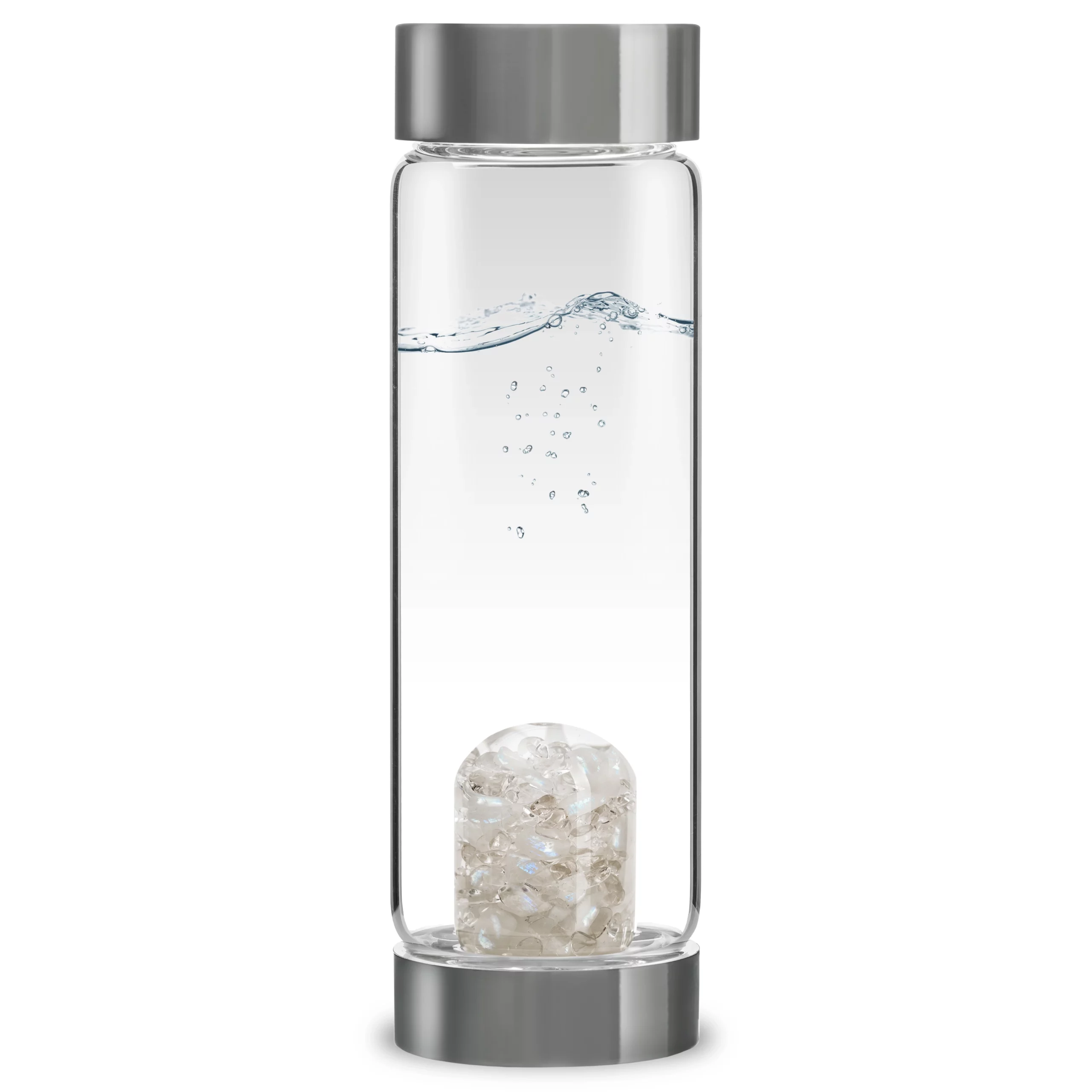 Designed in the German Alps, the VIA bottle features a variety of carefully hand-selected gemstones and is made from premium borosilicate, pollutant-free glass. Perfect for everyday use, as the gems are encased in a hand-crafted, interchangeable glass container that prevents any pollution of the water by the gems while preserving all their homeopathic benefits. The VitaJuwel method relieves you of bothersome scrubbing and cleaning of the gems. The exquisite stones in your ViA stay bright and shiny over the years.