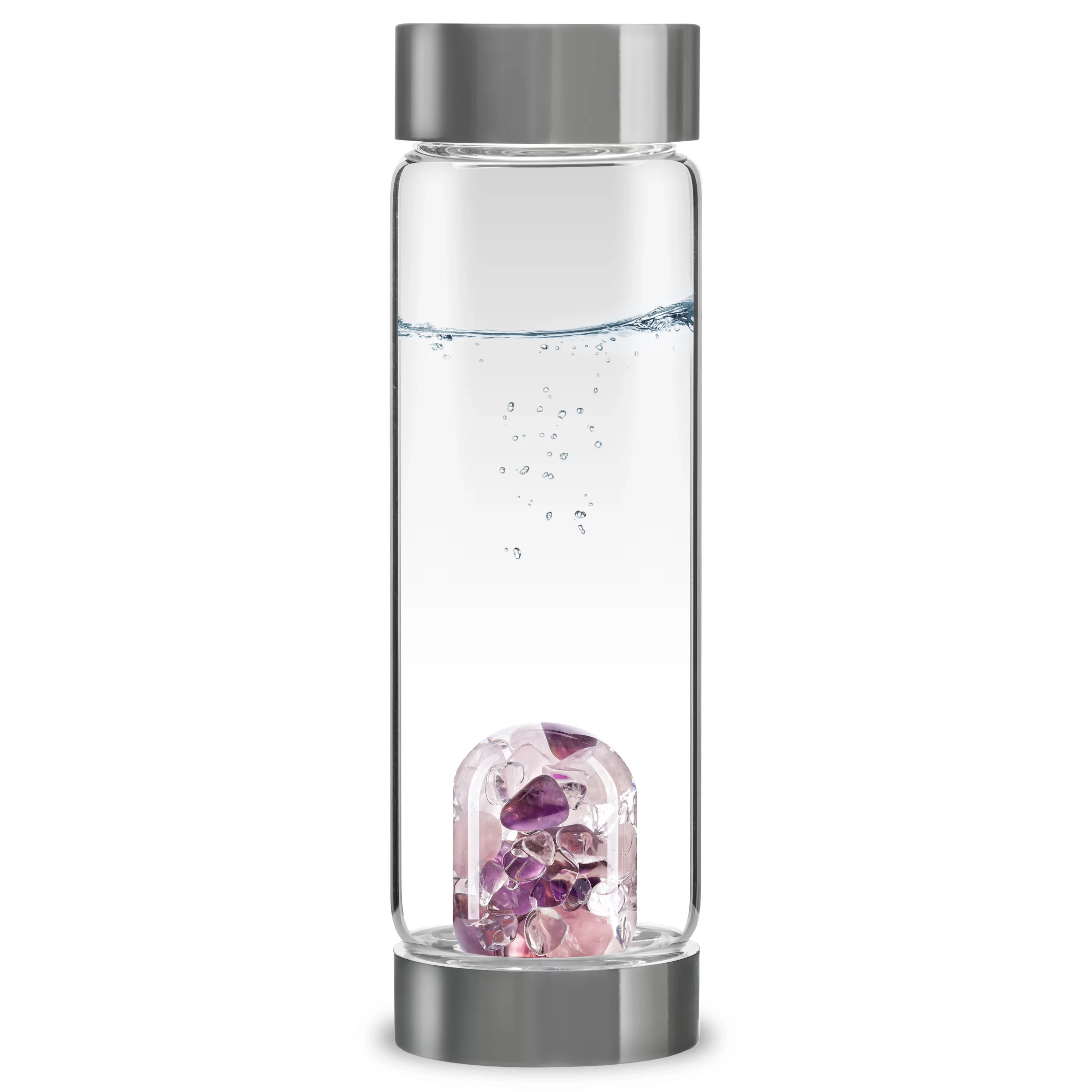 Designed in the German Alps , the VIA bottle features a variety of carefully hand-selected crystals and is made from premium borosilicate, pollutant-free glass. Perfect for everyday use, as the gems are encased in a hand-crafted, interchangeable glass container that prevents any pollution of the water by the gems while preserving all their energetical benefits. The VitaJuwel method relieves you of bothersome scrubbing and cleaning of the gems. The exquisite stones in your ViA stay bright and shiny over the years.